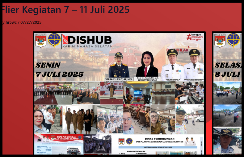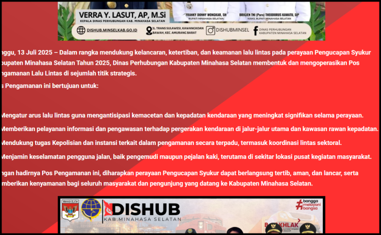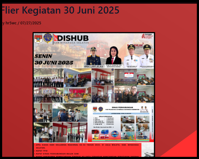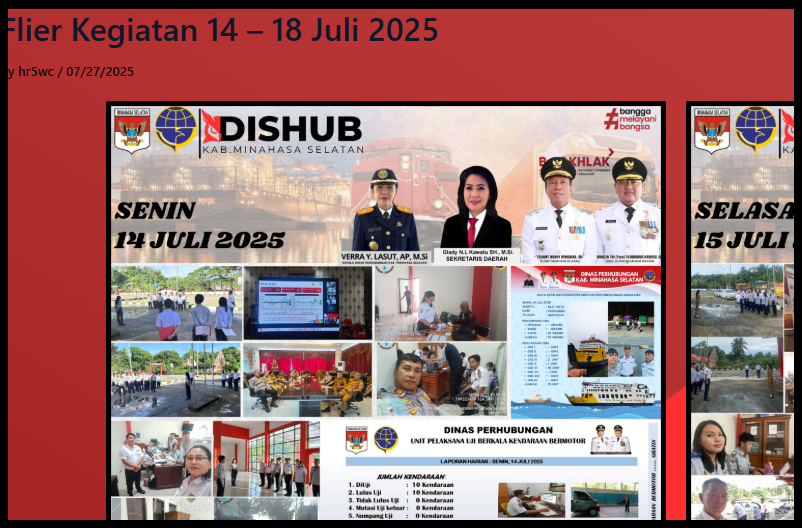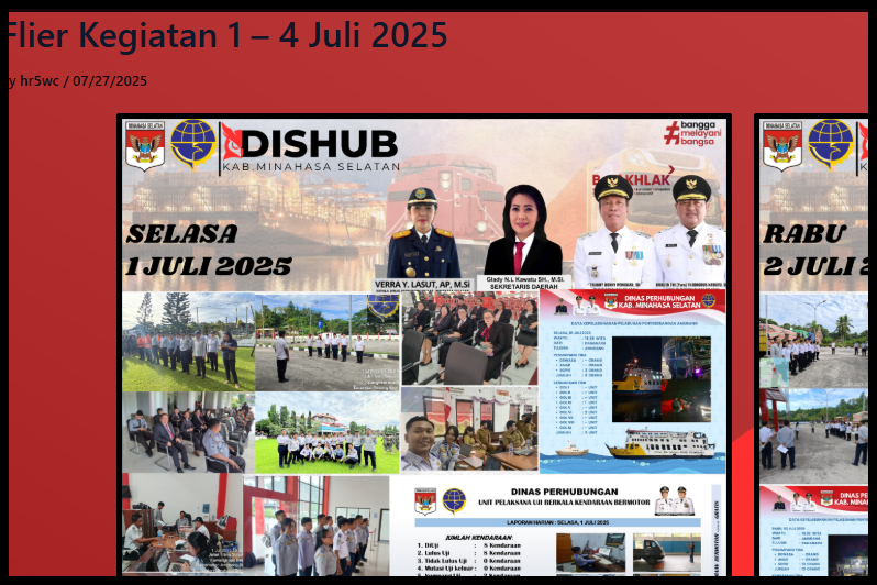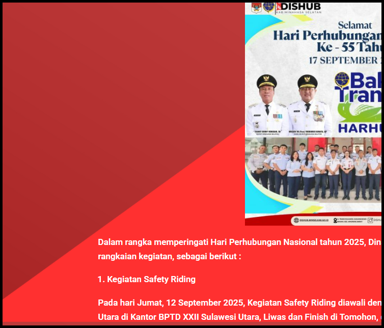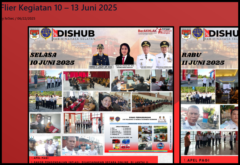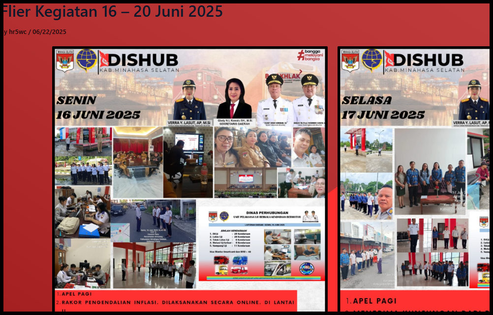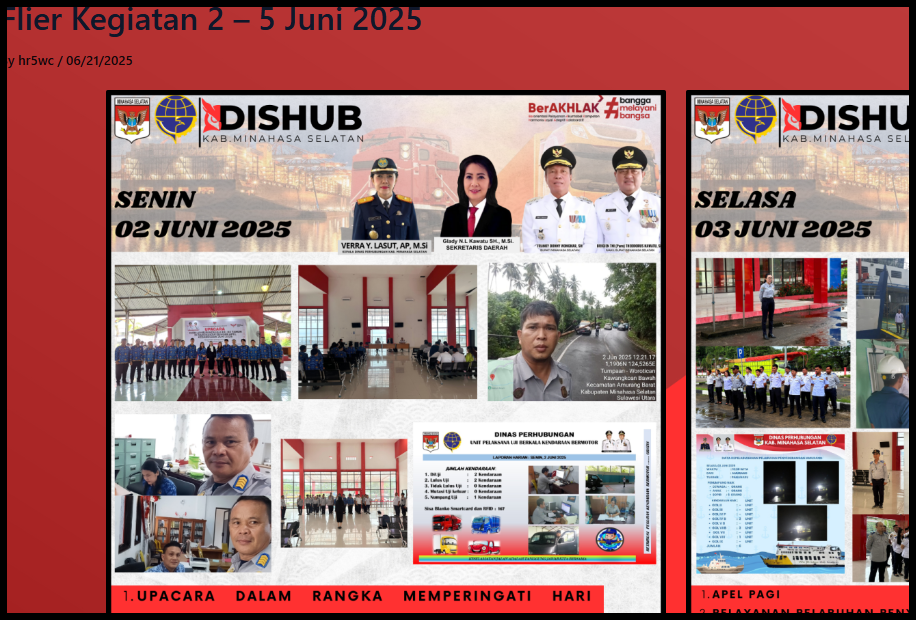 BERITA 2025 September Harhubnas 2025 Agustus HUT Proklamasi RI ke - 80 Juli Pengucapan Syukur Minsel 2025 Flier Kegiatan 21 - 25 Juli Flier Kegiatan 14 - 18 Juli Flier Kegiatan 7-11 Juli Flier Kegiatan 1-4 Juli Juni Rabu 18 Juni 2025, Dukungan Dishub Minsel untuk Poltekpel Sulut Flier Kegiatan 30 Juni Flier Kegiatan 23 - 26 Juni Flier Kegiatan 16 - 20 Juni Flier Kegiatan 10 -13 Juni Flier Kegiatan 2-5 Juni